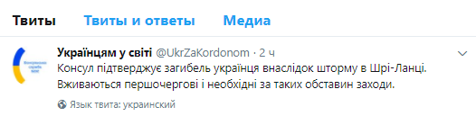 "Консул подтверждает гибель украинца в результате шторма в Шри-Ланке. Принимаются первоочередные и необходимые при таких обстоятельствах меры", - говорится в сообщении.