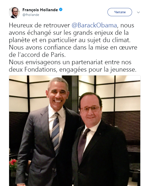 Кроме того, Обама встретился и с бывшим французским президентом Франсуа Олландом. Совместный снимок опубликован в официальном Twitter Олланда.