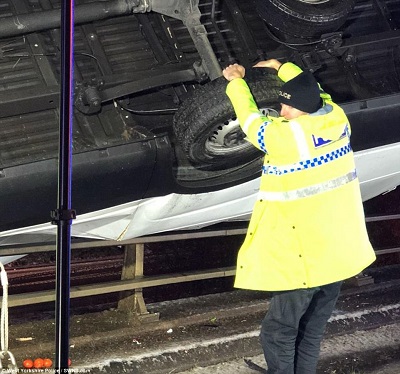 Как Супермен. Британский полицейский 15 минут держал свисающий с моста грузовик. Фото