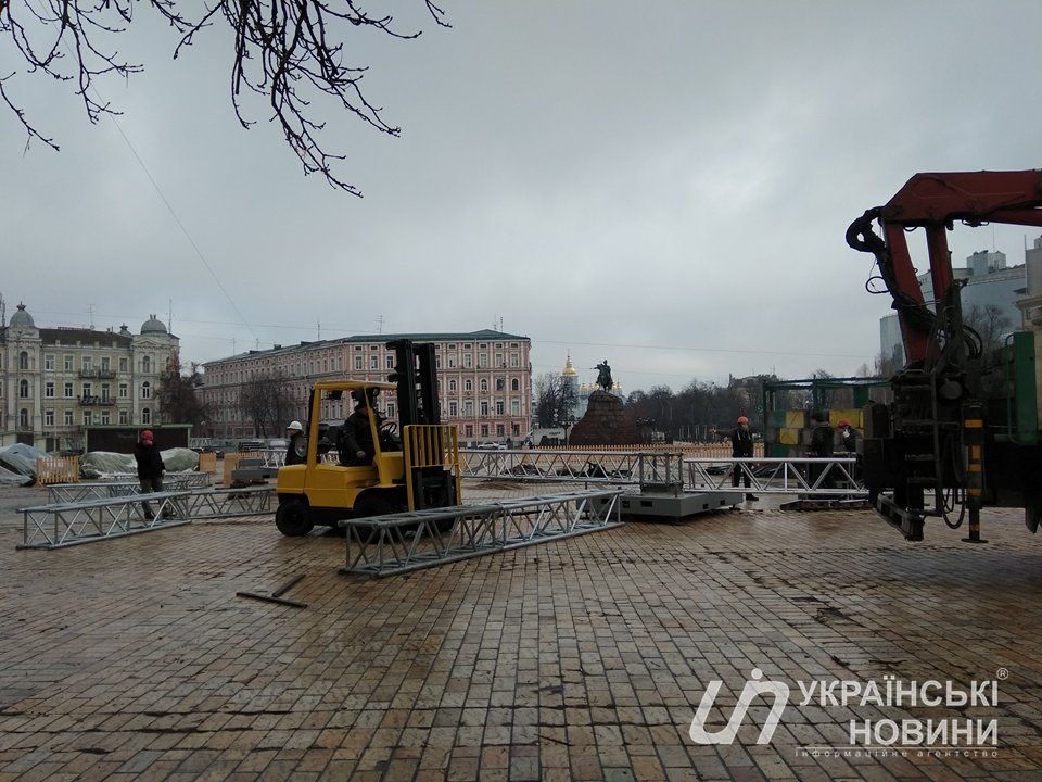 На Софийском площади монтажные работы продолжаются с самого утра. Работает техника. Сейчас строят конструкции и блоки на которых установят елку.