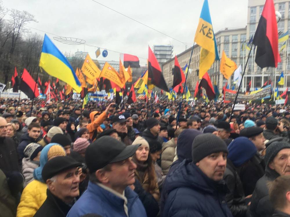 12:09 Сейчас митингующие выстраиваются в колону на перекрестке улицы Владимирской и Проспекта победы. Выйдут через бульвар Шевченко на Крещатик и пройдут до аллеи героев Небесной сотни. А потом пойдут на Банковую к Порошенко.