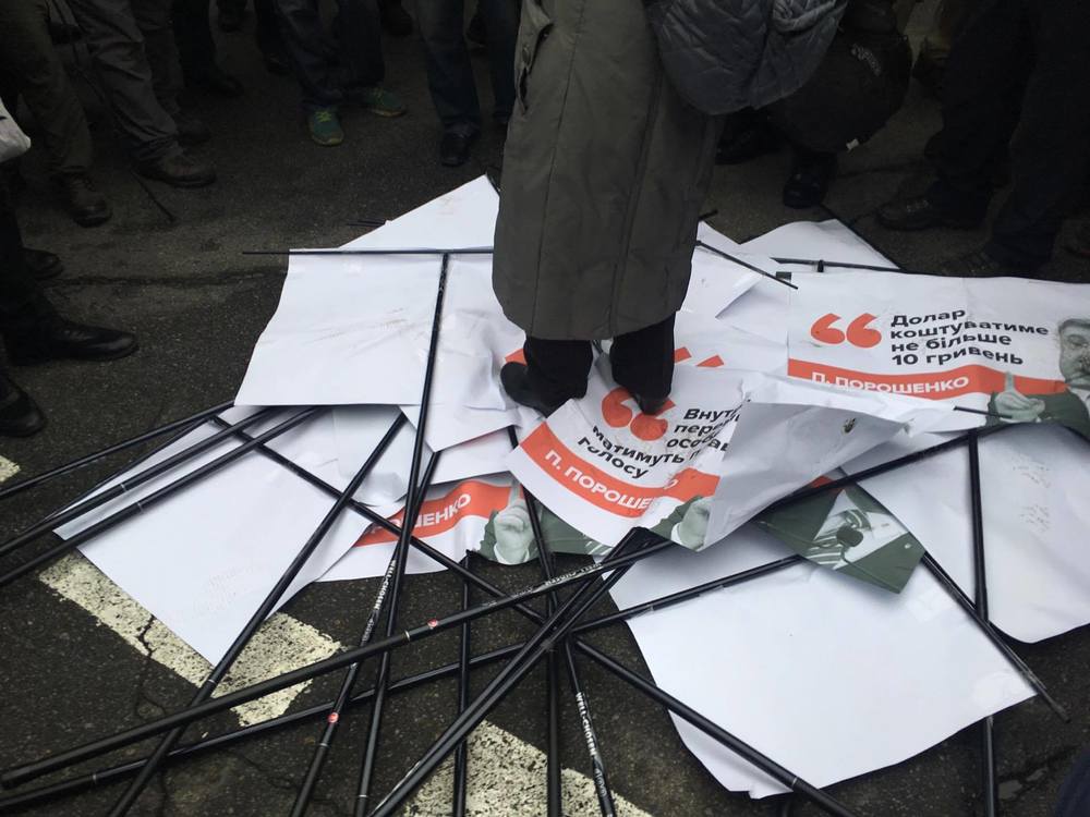 13:18 Начали бросать транспаранты в круг из митингующих с криками "Позор". Теперь весь МихоМайдан будет их топтать. По задумке организаторов, по "тысяче в день" от Порошенко пройдется вся процессия.