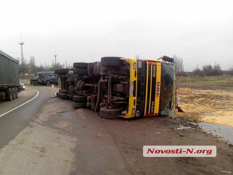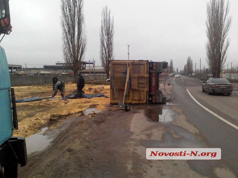 При повороте на улицу Остапа Вишни водитель не справился с управлением, из-за чего тягач перевернулся на левую сторону и все содержимое из прицепа высыпалось на проезжую часть. В результате ДТП никто не пострадал, автомобиль получил механические повреждения. Кукурузу уже перегрузили в другую машину.