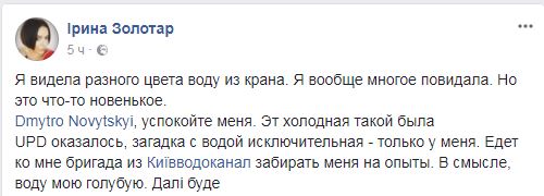 У киевлянки Ирины Золотар дома из крана потекла ярко-голубая вода. Об удивительном событии она сообщила на своей странице в Facebook.