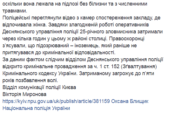По данному факту следственным отделом Деснянского управления полиции открыто уголовное производство по ч. 1 ст. 152 (Изнасилование) Уголовного кодекса Украины. Задержанному грозит до пяти лет лишения свободы.
