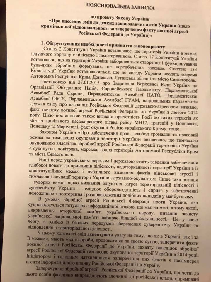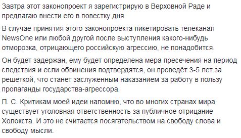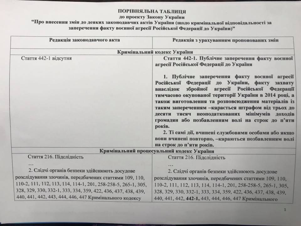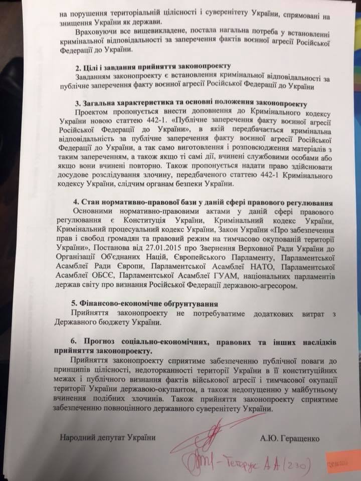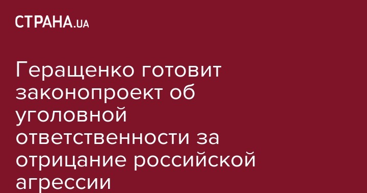 "Для того, чтобы защитить информационное пространство Украины от "мураевщины" и использовать силу закона, я сегодня подписал законопроект о дополнении Криминального Кодекса Украины статьей 442-1, которой предлагаю ввести уголовную ответственность (до 5 лет лишения свободы) за публичное отрицание факта военной агрессии Российской Федерации против Украины. Завтра этот законопроект я зарегистрирую в Верховной Раде и предлагаю внести его в повестку дня", - написал Геращенко.