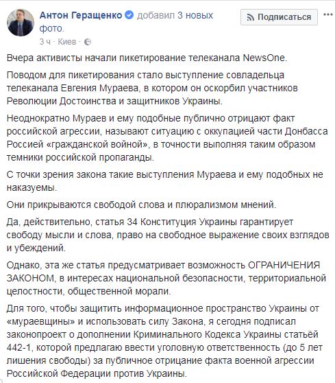 "Неоднократно Мураев и ему подобные публично отрицают факт российской агрессии, называют ситуацию с оккупацией части Донбасса Россией "гражданской войной", в точности выполняя таким образом темники российской пропаганды. С точки зрения закона такие выступления Мураева и ему подобных не наказуемы. Они прикрываются свободой слова и плюрализмом мнений. Да, действительно, статья 34 Конституция Украины гарантирует свободу мысли и слова, право на свободное выражение своих взглядов и убеждений. Однако, эта же статья предусматривает возможность ограничения законом, в интересах национальной безопасности, территориальной целостности, общественной морали", - заявил Геращенко.