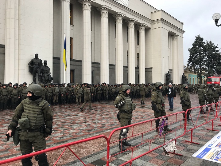 Люди начинают петь гимн Украины, кричат "Слава Украине!", "Украина, вставай" они объявили о начале митинга под Радой. Звучат заявления о старте процедуры импичмента.
