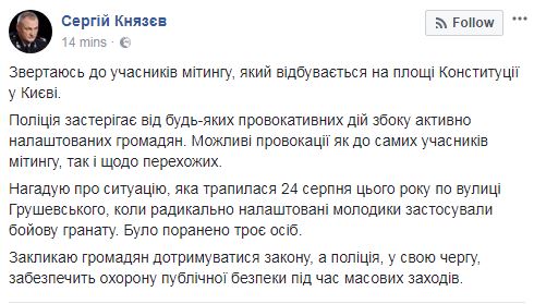 "Обращаюсь к участникам митинга, который происходит на площади Конституции в Киеве. Полиция предостерегает от любых провокационных действий со стороны активно настроенных граждан. Возможны провокации как к самим участникам митинга, так и по прохожих", - написал он, вспомнив о ситуации, произошедшей 24 августа по улице Грушевского, когда радикально настроенные молодые применили боевую гранату, в результате чего были ранены три человека.