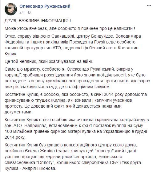 "Именно эту мразоту, лично я, Александр Ружанский, разоблачил в коррупции, проведя расследование его преступной деятельности, которое было положено в основу уголовного производства против него, которое сейчас уже год находится в суде, где я являюсь официальным свидетелем. Константин Кулик, является лицом, который лично, в января 2014 года помогал финансировать титушек Жилина, которые убивали и калечили участников протеста. Это доказанный факт, которым располагает следствие. Константин Кулик является тем лицом,который возглавил и крышевал контрабанду в зоне АТО. Например, установленным факт поставок угля на сумму 100 000 000 гривен фирмой матери Кулика на Укрзализныцю в декабре 2014 года", - заявил Ружанский.