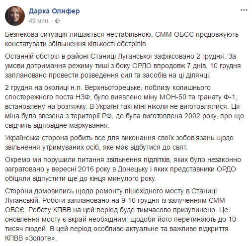 "Последний обстрел в районе станицы Луганской зафиксировано 2 декабря. При условии соблюдения режима тишины со стороны ОРДЛО в течение 7 дней, 10 декабря запланировано провести разведение сил и средств на этой территории", - написала она.