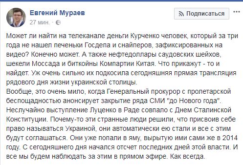 "Может ли найти на телеканале деньги Курченко человек, который за три года не нашел печеньки Госдепа и снайперов, зафиксированных на видео? - заявил Мураев на своей странице в Facebook. - Конечно может. А также нефтедоллары саудовских шейхов, шекели Моссада и биткойны Компартии Китая. Что прикажут - то и найдет. Уж очень сильно их подкосила сегодняшняя прямая трансляция рядового дня жизни украинской столицы".