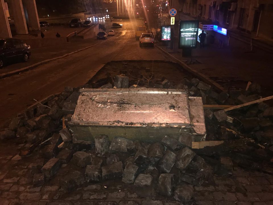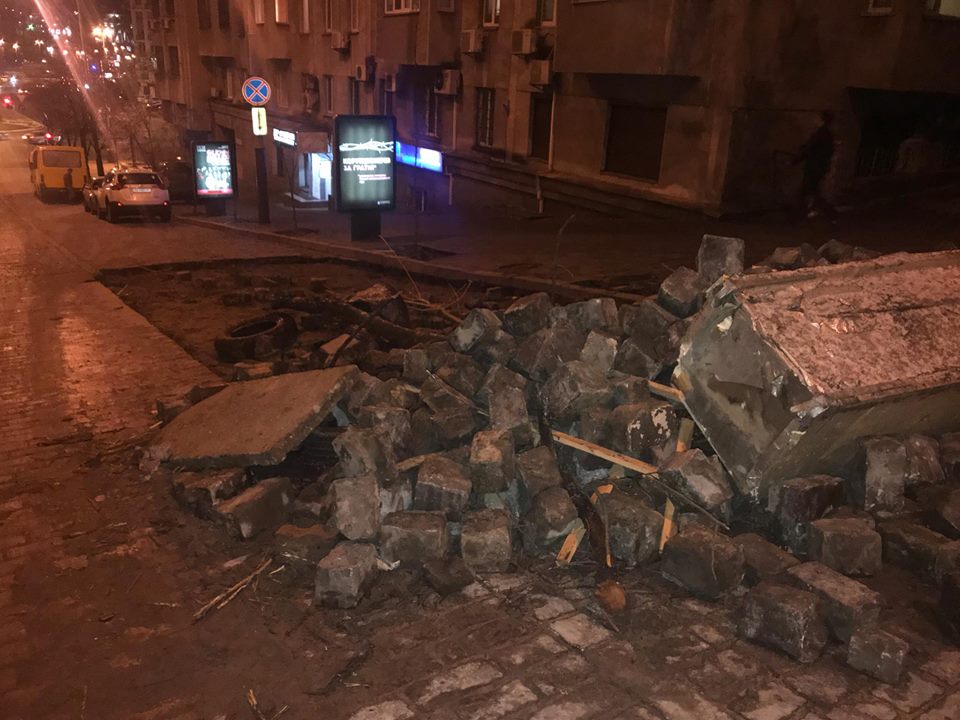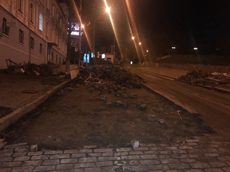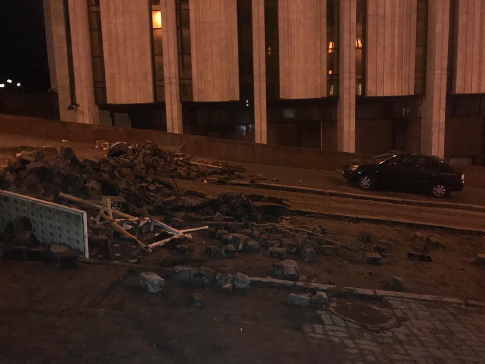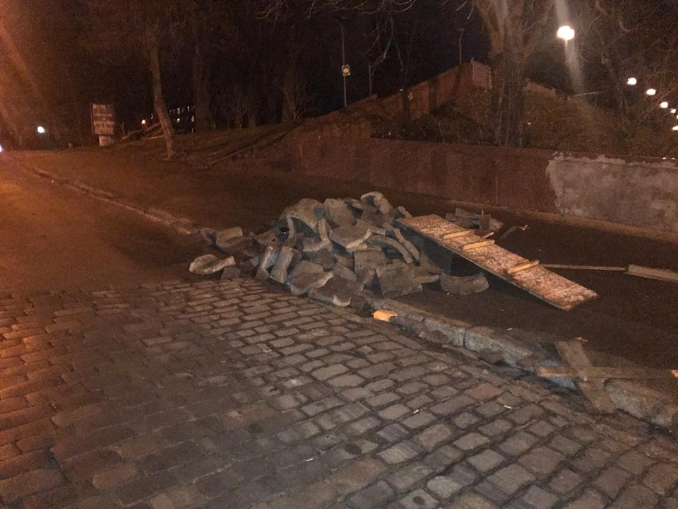 В Киеве на улице Костельной, где сегодня с утра силовики пытались арестовать Михаила Саакашвили, однако его сторонники блокировали движение, осталась разобранная брусчатка с проезжей части и баррикады. Об этом сообщает корреспондент "Страны".