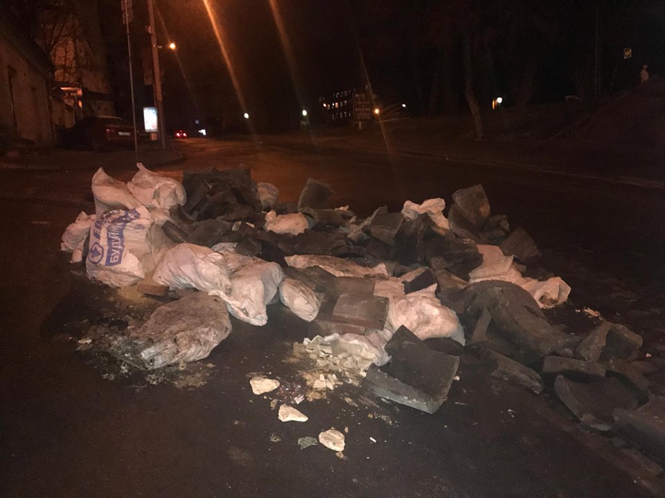 На дороге лежат разбитые бетонные клумбы, которыми перекрывали дорогу автомобилям СБУ.
