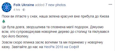 "Пока вы летаете во снах, наша зеленая красавица уже прибыла в Киев. Это была длинная, трогательная и полна магии путешествие. Спасибо всем, кто сопровождал новогоднее дерево в столицу и заботился о ее безопасности. Совсем скоро елка засияет огнями и мы погрузимся в новогоднюю сказку ", - говорится в сообщении.