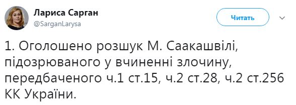 "Объявлен розыск Саакашвили, подозреваемого в совершении преступления, предусмотренного ч.1 ст.15, ч.2 ст.28, ч.2 ст.256 УК Украины", – сообщила она.