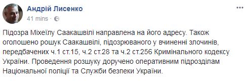 "Подозрение Саакашвили направлено ​на его адрес. Также объявлен розыск Саакашвили, подозреваемого в совершении преступлений, предусмотренных ч.1 ст.15, ч.2 ст.28 и ч.2 ст.256 Уголовного кодекса Украины", - пишет он в Facebook.