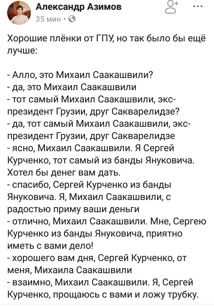 В соцсетях также иронизируют над записью разговора "Курченко и Саакашвили". Один из пользователей написал свой вариант их беседы - чуть более прямолинейный, чем тот, что показал генпрокурор Луценко.