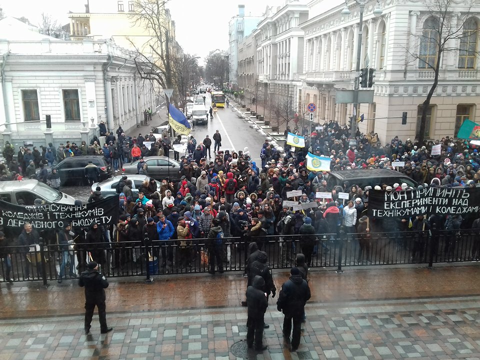 Как сообщает "Украинская правда", на улице Грушевского стоит автомобиль с громкоговорителями, и человек призывает нардепов не принимать "преступный" законопроект, о передаче колледжей и ПТУ на финансирование местных бюджетов.