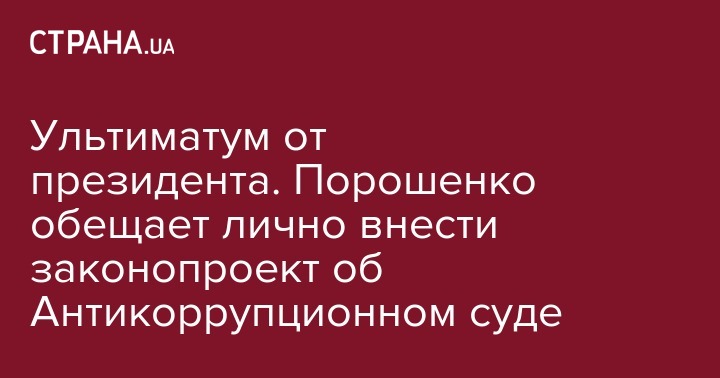 "Мое предложение все еще в силе. Однако если до начала следующей недели я не увижу прогресса, в течение семи-десяти дней самостоятельно подготовлю и внесу соответствующий законопроект. Прошу народных депутатов снять с повестки дня старый законопроект "Об антикоррупционном суде", как это рекомендовала Венецианская комиссия и расчистить пространство для нового проекта", - подчеркнул Порошенко.