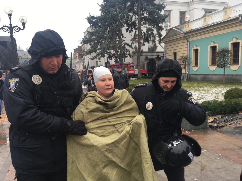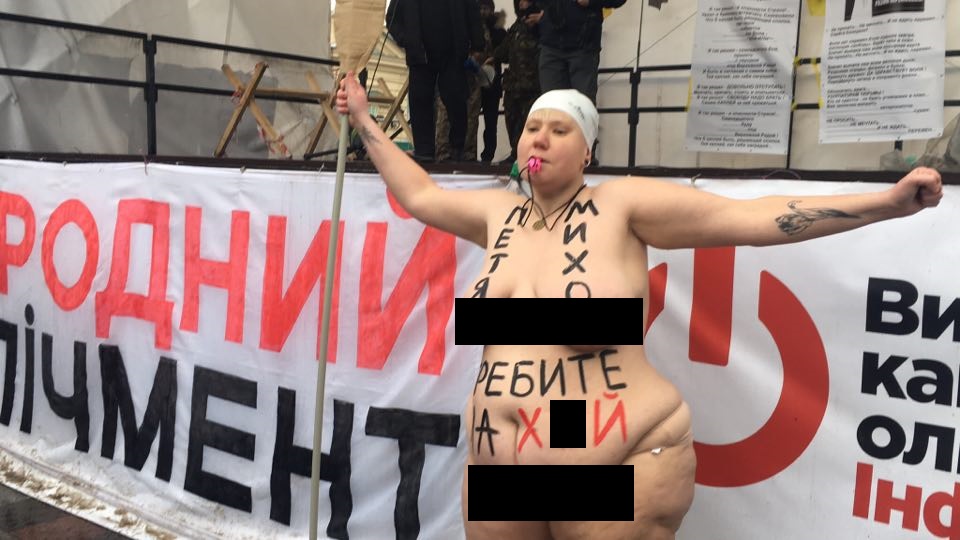 На одной груди у нее было написано "Петя" на другой "Михо", а на животе - "гребите на х#й". Последний лозунг женщина несколько раз прокричала, добавив "оставьте народ в покое".