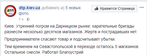 "Киев. Утренний погром на Дарницком рынке: карательные бригады разнесли несколько десятков магазинов. Предприниматели спасают товар и подсчитывает убытки", - говорится в сообщении.