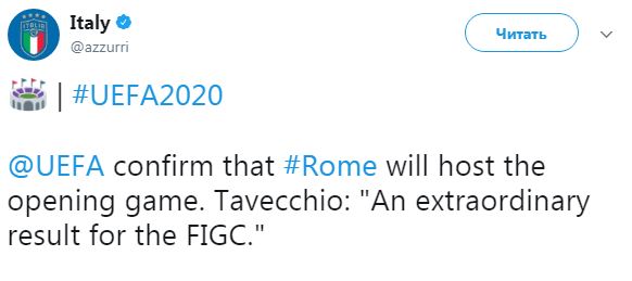 Матч-открытие Евро-2020 состоится на римском "Стадио Олимпико".