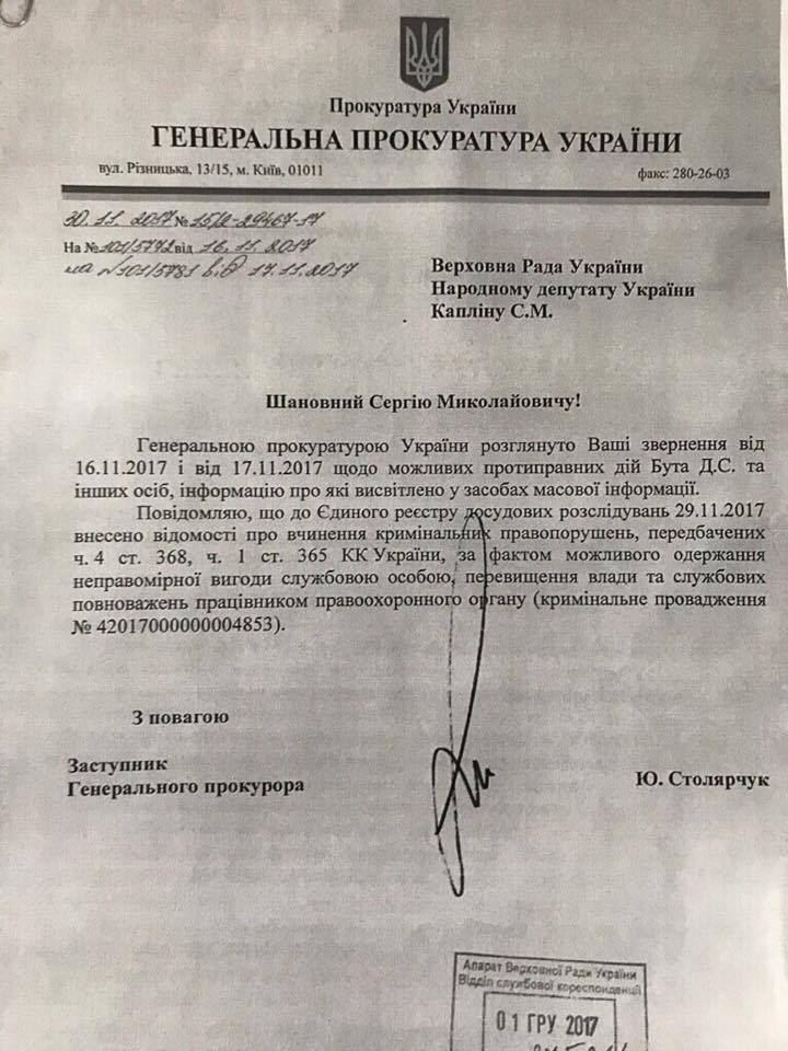 В документе, в частности, отмечается, что после публикаций в СМИ "в Единый реестр досудебных расследований 29.11.2017 внесены сведения о совершении уголовных правонарушений, предусмотренных ч. 4 ст.368, ч. 1 ст. 365 УК Украины, по факту возможного получения неправомерной выгоды служебным лицом, превышения власти и служебных поломочий сотрудником правоохранительного органа".