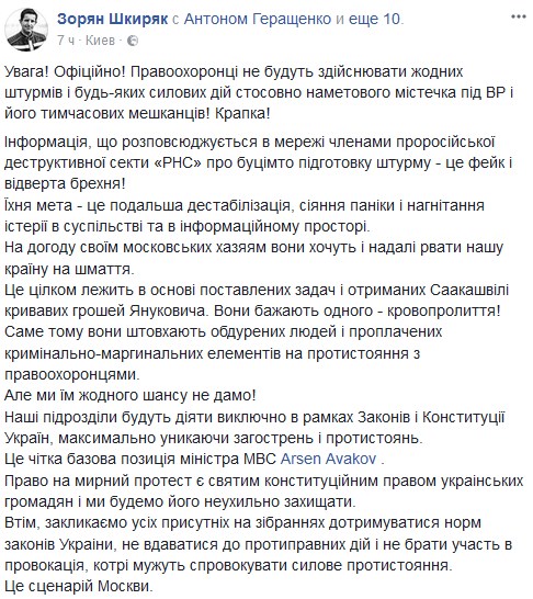 Также, Шкиряк подчеркнул, что "информация, распространяемая в сети членами пророссийской секты "РНС" о якобы подготовке штурма является фейком.