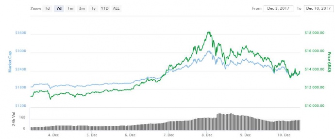Как сообщалось, 8 декабря биткоин установил исторический максимум, взлетев более чем на 20% и преодолев отметку в $18 тысяч.