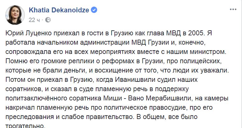 "Юрий Луценко приехал в гости в Грузию как глава МВД в 2005. Я работала начальником администрации МВД Грузии и, конечно, сопровождала его на всех мероприятиях вместе с нашим министром. Помню его громкие реплики о реформах в Грузии, про полицейских, которые не брали деньги, и восхищение от того, что люди их уважали. Потом он приехал в Грузию, когда Иванишвили судил наших соратников, и сказал в суде пламенную речь в поддержку политзаключённого соратника Миши - Вано Мерабишвили, на камеры накричал пламенную речь про политическое правосудие, про его преследования и слабое правительство. В общем, все было трогательно.