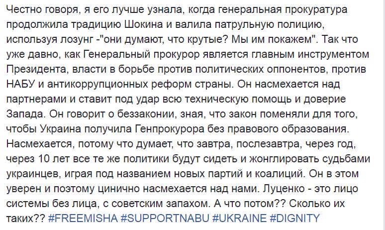 Честно говоря, я его лучше узнала, когда генеральная прокуратура продолжила традицию Шокина и валила патрульную полицию, используя лозунг -"они думают, что крутые? Мы им покажем". Так что уже давно, как Генеральный прокурор является главным инструментом Президента, власти в борьбе против политических оппонентов, против НАБУ и антикоррупционных реформ страны. Он насмехается над партнерами и ставит под удар всю техническую помощь и доверие Запада. Он говорит о беззаконии, зная, что закон поменяли для того, чтобы Украина получила Генпрокурора без правового образования. Насмехается, потому что думает, что завтра, послезавтра, через год, через 10 лет все те же политики будут сидеть и жонглировать судьбами украинцев, играя под названием новых партий и коалиций. Он в этом уверен и поэтому цинично насмехается над нами. Луценко - это лицо системы без лица, с советским запахом. А что потом? Сколько их таких?", - пишет Деканоидзе.