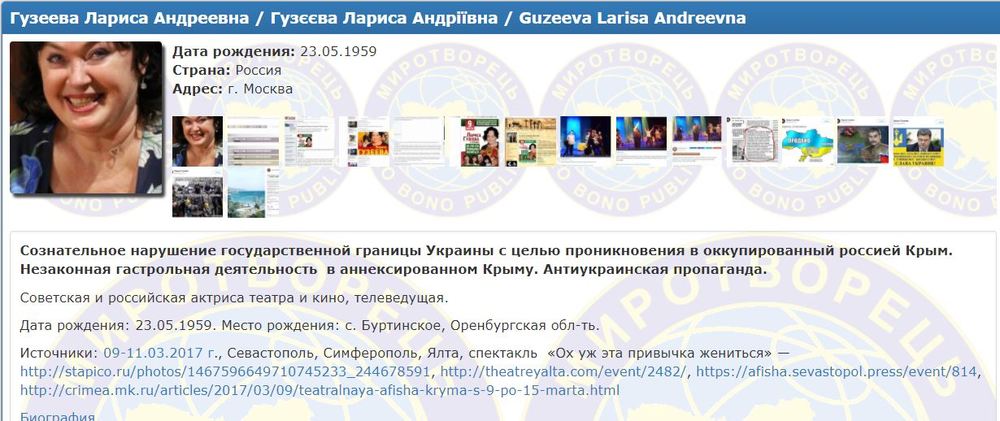 Гузеева внесена в базу данных за "сознательное нарушение государственной границы Украины с целью проникновения" в Крым и за "незаконную гастрольную деятельность" в Крыму.