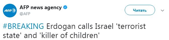 Ранее президент Турции назвал Израиль "террористическим государством" и "уничтожителем детей".