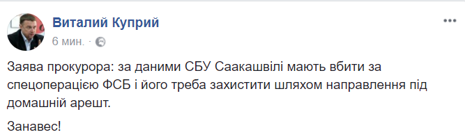 16:14  "Заявление прокурора: по данным СБУ Саакашвили должны убить в рамках  спецоперацией ФСБ, и его надо защитить путем направления под домашний арест.