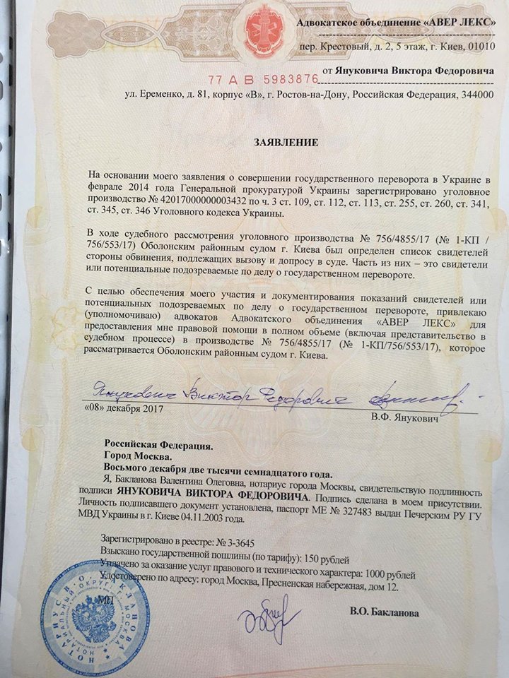 Беглый президент вернул в дело своих адвокатов, в частности, Виталия Сердюка. Янукович написал соответствующее заявление, которое заверил у российского нотариуса.