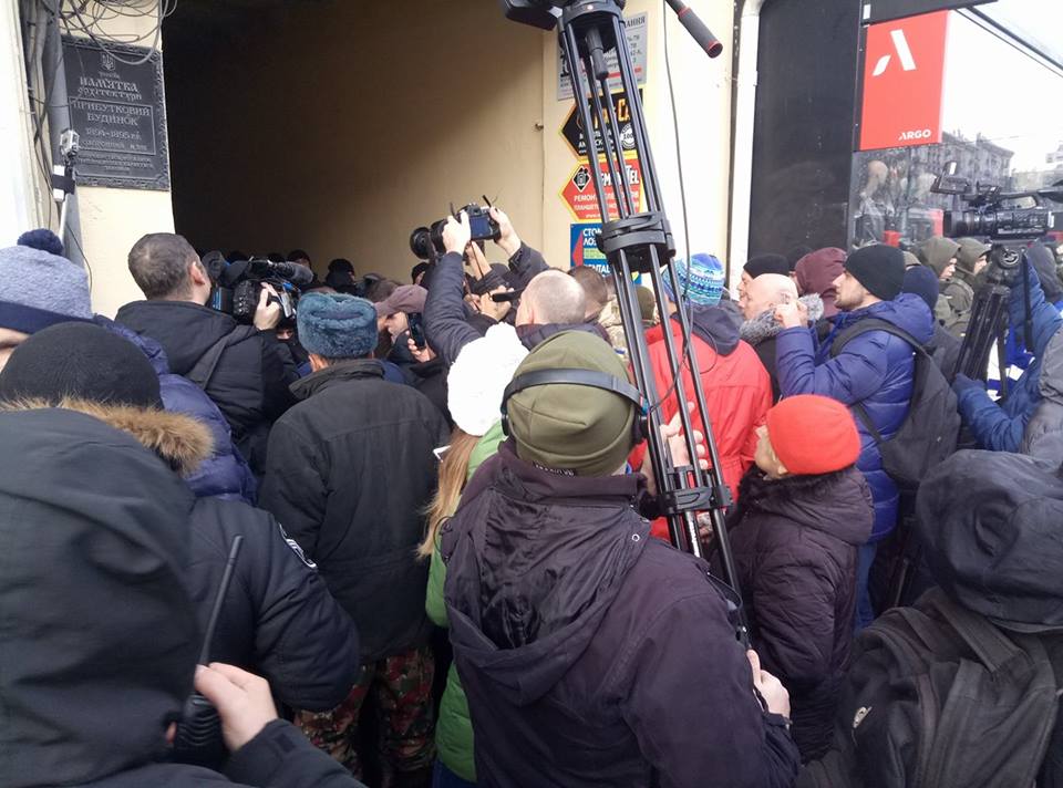 В толпе слышится диалог: "Ну что это такое, у нас уже полиция конституцией правит?! Решает, кому можно зайти, а кому нельзя" - возмущается женщина. "Проститутки порошенковские " - кричат активисты. Люди также требуют пропустить Давида Сакварелидзе.