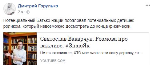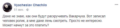 Журналист Вячеслав Чечило пишет о том, что видео неинтересное: "Даже не знаю, как они будут раскручивать Вакарчука. Вот записал человек ролик, а мне даже лень смотреть. Просто не интересно. Может начнут за это платить?"