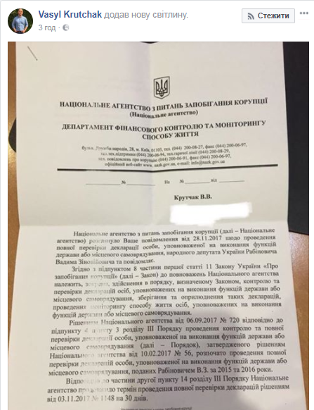 "По решению Национального агентства от 06.09.2017 №720 в соответствии с подпунктом 4 пункта 3 раздела ІІІ Порядка проведения контроля и полной проверки декларации лица, уполномоченного на выполнение функций государства или местного самоуправления, утвержденного решением Национального агентства от 10.02.2017 №56, начато проведение полной проверки декларации лица, уполномоченного на выполнение функций государства или местного самоуправления, поданных Рабиновичем В. З. за 2015 и 2016 года.", - идет речь в ответе НАПК на запрос журналиста.