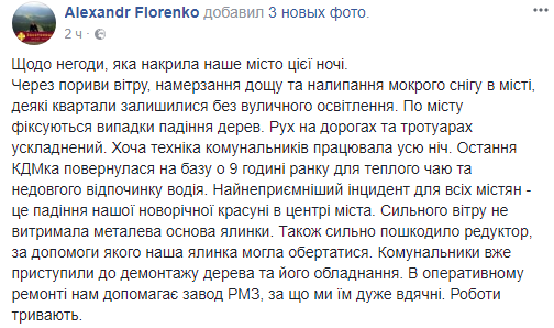 "Неприятный инцидент для всех горожан - это падение нашей новогодней красавицы в центре города. Сильного ветра не выдержала металлическая основа елки. Также сильно повредило редуктор, с помощью которого наша елка могла вращаться. Коммунальщики уже приступили к демонтажу дерева и его оборудования", - написал городской чиновник.