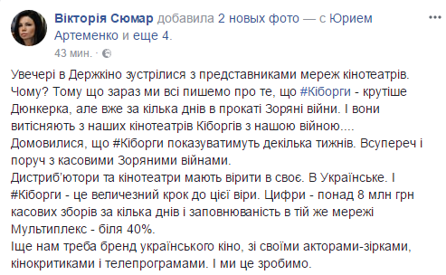 "Вечером в Госкино встретились с представителями сетей кинотеатров. Почему? Потому что сейчас мы все пишем о том, что  "Киборги" - круче "Дюнкерка", но уже через несколько дней в прокате "Звездные войны". И они вытесняют из наших кинотеатров киборгов с нашей войной... Договорились, что Киборги будут показывать несколько недель. Вопреки и рядом с кассовыми "Звездными войнами". Дистрибьюторы и кинотеатры должны верить в свое. В украинском. И "Киборги" - это огромный шаг к этой вере. Цифры - более 8 млн грн кассовых сборов за несколько дней и заполняемость в той же сети "Мультиплекс" - около 40%", - написала она