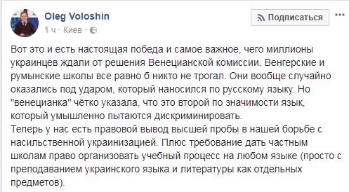 "Вот это и есть настоящая победа и самое важное, чего миллионы украинцев ждали от решения Венецианской комиссии. Венгерские и румынские школы все равно б никто не трогал. Они вообще случайно оказались под ударом, который наносился по русскому языку. Но "венецианка" четко указала, что это второй по значимости язык, который умышленно пытаются дискриминировать", - написал на своей странице в Facebook эксперт-международник Олег Волошин.