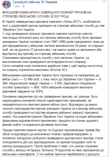 В Украине завершилась призывная кампания "Осень-2017". Военкоматы выполнили госзадание на 100%. Об этом сообщает пресс-служба командования сухопутный войск ВСУ в Facebook.