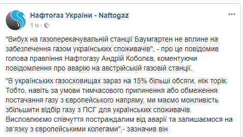 Взрыв на центрально-европейском газовом хабе OMV в австрийском Баумгартене не повлияет на обеспечение топливом украинцев. Об этом сообщил глава госкомпании "Нафтогаз Украины" Андрей Коболев, передает пресс-служба компании в Facebook.