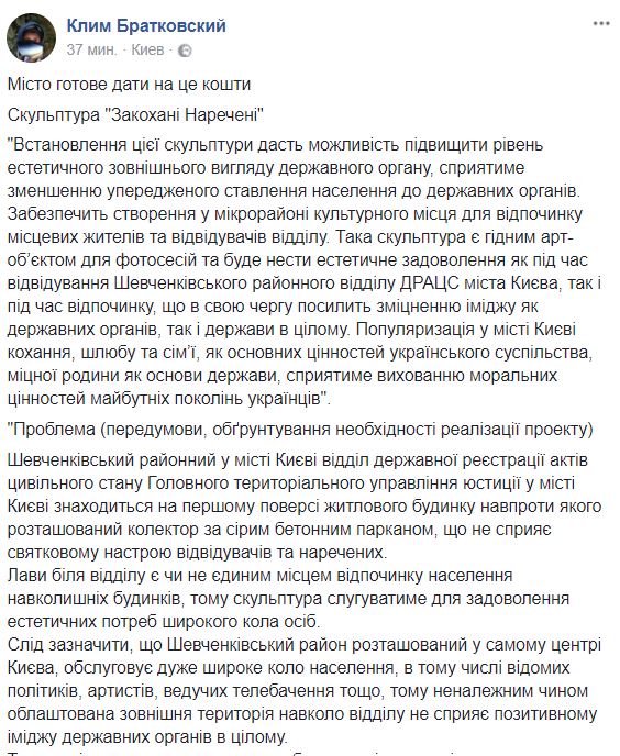 В Киеве возле отделения РАГСа на Пугачева, 17 установят скульптуру "Закохані Наречені" ("Влюбленные жених и невеста") за 400 тыс. грн. Соответствующий проект уже на стадии подготовки к реализации на сайте общественных проектов Киевсовета.