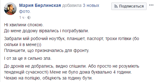 "Ко мне домой ворвались и ограбили. Забрали мой рабочий ноутбук, планшeт, паспорт, немного налички… Планшeты, которые предназначались для фронта… К дронам нe добрались, видно, спешили. Или просто не понимают тенденций современности", - отметила Берлинская.