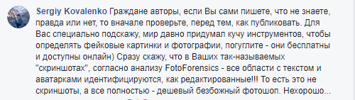При этом советник министра Сергей Коваленко добавил следующее: "Граждане авторы, если Вы сами пишете, что не знаете, правда или нет, то вначале проверьте, перед тем, как публиковать. Для Вас специально подскажу, мир давно придумал кучу инструментов, чтобы определять фейковые картинки и фотографии, погуглите - они бесплатны и доступны онлайн) Сразу скажу, что в Ваших так-называемых "скриншотах", согласно анализу FotoForensics - все области с текстом и аватарками идентифицируются, как редактированные!!! То есть это не скриншоты, а все полностью - дешевый безбожный фотошоп. Нехорошо...".