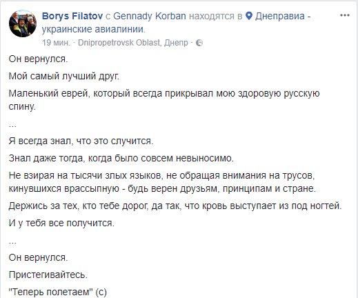 О возвращении политика радостно сообщил в Facebook его друг, мэр Днепра Борис Филатов.