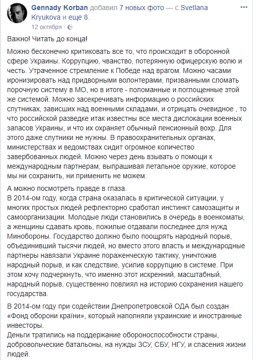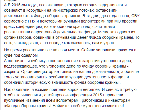 В частности, Корбан еще в октябре сообщил в Facebook, что закрыто уголовное дело по поводу хищения средств "Фонда обороны страны".