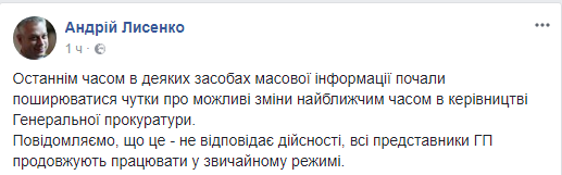 "В последнее время в некоторых средствах массовой информации начали распространяться слухи о возможных изменениях в ближайшее время в руководстве Генеральной прокуратуры. Сообщаем, что это не соответствует действительности, все представители ГП продолжают работать в обычном режиме", - написал Лысенко.